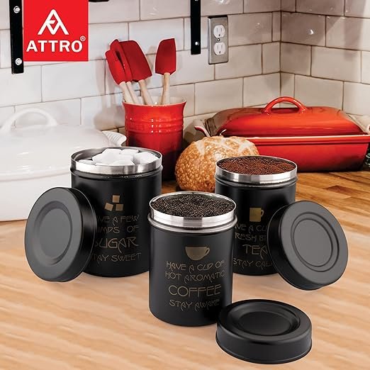 ATTRO Classic Stainless Steel Airtight Kitchen Storage Container Set is designed to combine elegance, durability, and everyday functionality. This set of 3 containers, each with a generous 1100 ml capacity, is perfect for storing tea, coffee, sugar, dry fruits, or spices while keeping them fresh and flavorful. Crafted from premium-quality stainless steel with a stylish matte black finish, these containers add a touch of sophistication to any kitchen décor. The airtight lids ensure complete protection from moisture, air, and odors, preserving the natural aroma and taste of your ingredients. Easy to clean, rust-resistant, and long-lasting, the Attro Classic Set is an ideal choice for a neat, organized, and elegant kitchen.