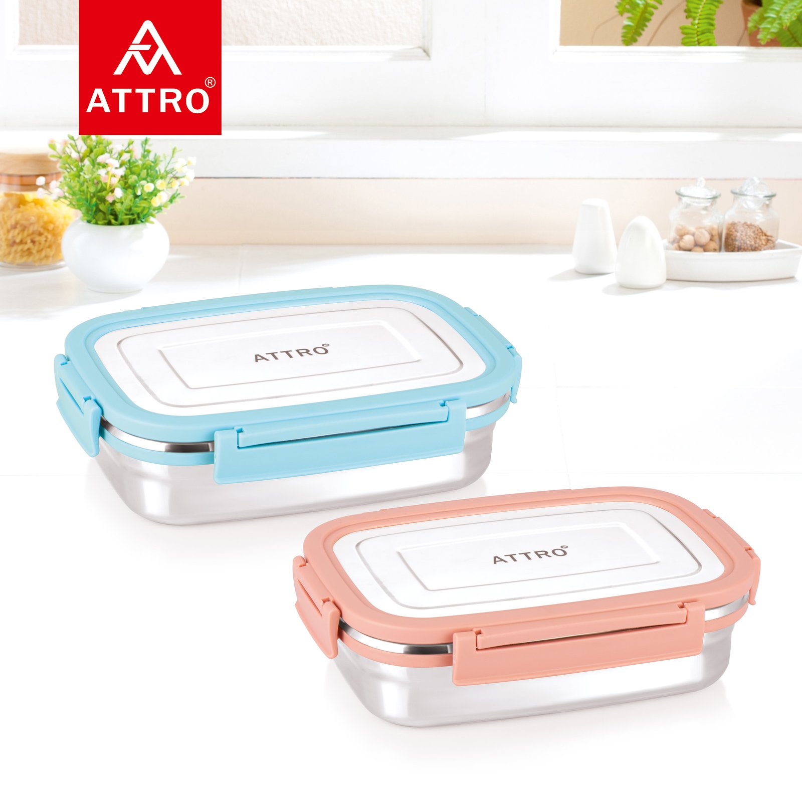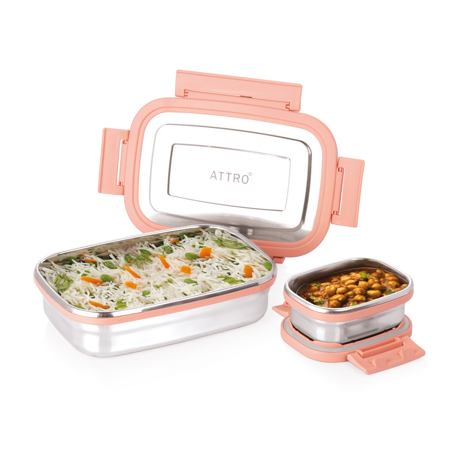 Introducing the ATTRO Click Eat Junior Rectangular Stainless Steel Lunch Box, your ultimate solution for convenient, spill-proof meal storage on-the-go. Whether you’re headed to the office, school, or a delightful picnic, our innovative lunch box combines functionality, durability, and style to elevate your dining experience. Crafted from premium stainless steel, our lunch box is built to withstand the rigors of daily use while maintaining its sleek appearance. Its compact design makes it the perfect companion for individuals with busy lifestyles, fitting seamlessly into any bag or backpack for easy transport. Featuring a spacious 650ml main compartment, our lunch box offers ample space to pack your favorite meals, Plus, with an additional 140ml small container included, you can conveniently store sauces, dips, chutney & much more. Say goodbye to messy mishaps with our lunch box’s advanced 4 side lock feature, which ensures a secure and airtight seal to keep your meals fresh and intact. Easy to clean and maintain. Simply rinse with soap and water or pop it in the dishwasher for effortless cleaning, ensuring that your lunch box remains hygienic and ready for your next culinary adventure. Upgrade your lunch game with the ATTRO Click Eat Junior Rectangular Stainless Steel Lunch Box and enjoy the convenience of leak-proof, airtight meal storage wherever life takes you. With its compact design, generous capacity, and innovative features, it’s the perfect companion for office lunches, school days, picnics, and more.