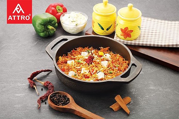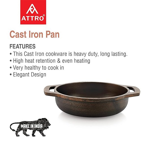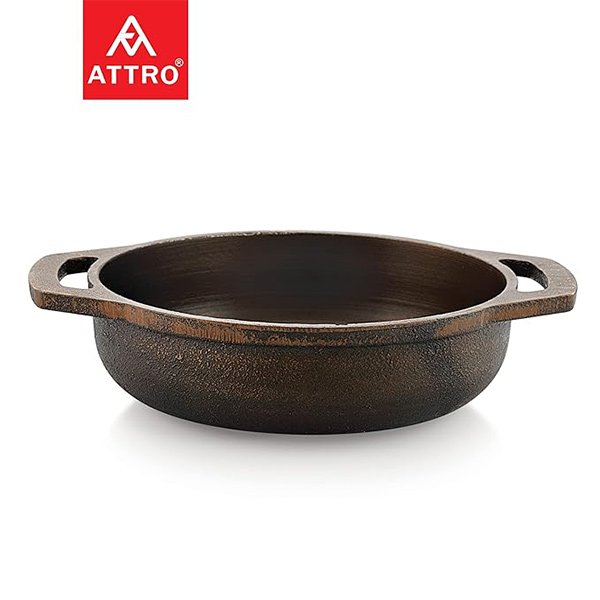 ATTRO FLAT BASE KADHAI – Cast Iron Kadai is ideal for preparing traditional cuisines, especially those which require slow cooking. Compared to non-stick products, this kadai is a safe and healthy option. Cleaning use a soft scrubber to clean your kadai. Apply oil and store it in a dry place.