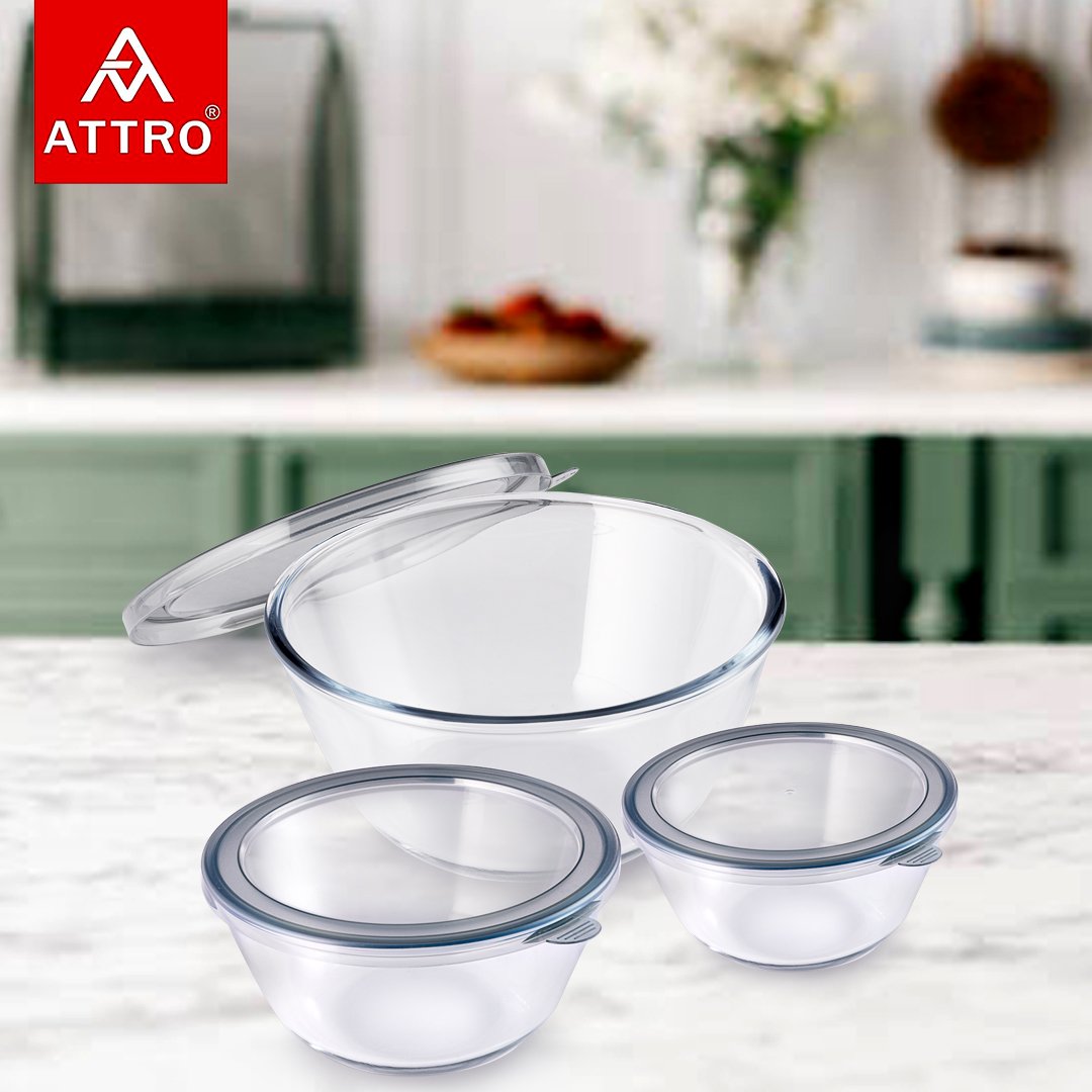 ATTRO Glassox Classic Mixing Bowl Set is made from high-quality borosilicate glass, known for its superior strength, clarity, and temperature resistance. This versatile set includes 3 convenient sizes—500ml, 1000ml, and 1600ml—making it ideal for mixing batter, preparing salads, kneading dough, whisking sauces, storing leftovers, and organising meal prep. Each bowl comes with a secure, airtight lid that locks in freshness and prevents spills, making it perfect for refrigerator and freezer storage.The transparent body allows you to easily see contents without opening the lid, while the stain-resistant and odour-free surface ensures long-lasting hygiene. Designed for modern kitchens, these bowls are microwave safe, oven safe, freezer safe, and dishwasher safe, offering maximum convenience for everyday cooking and baking tasks. Their heat-resistant borosilicate construction ensures durability even under high temperatures, making them excellent for baking, reheating, marinating, and serving meals directly from the oven to the table.Whether you’re preparing ingredients, storing pre-cut veggies, packing snacks, or serving salads and desserts, the Attro Glassox Mixing Bowl Set delivers unmatched versatility. These bowls are perfect for home kitchens, restaurants, cafés, and meal-prep enthusiasts who value practicality and premium quality. Lightweight yet strong, easy to clean, and space-saving, they bring elegance and efficiency to your daily cooking routine.