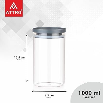 The Attro Glassox Borosilicate Round Glass Storage Jar with Airtight PP Lid combines elegance with practicality. Made from high-quality borosilicate glass, this durable and scratch-resistant jar is designed to withstand temperature changes, ensuring long-lasting use. The airtight polypropylene (PP) lid creates a secure seal, keeping your contents fresh and moisture-free. This odorless and BPA-free storage jar is made with food-grade materials, ensuring no harmful chemicals or unpleasant smells, making it completely safe for food storage. Its clear glass design allows for easy visibility, so you can quickly identify the contents without opening the jar, while the stackable design helps save valuable space in your kitchen or pantry.Perfect for a variety of uses, from storing dry foods, spices, and pantry essentials to liquids and leftovers, this versatile jar meets all your storage needs. It’s also a sustainable, eco-friendly option, reducing reliance on plastic and offering a reusable, long-lasting solution. Easy to clean and dishwasher safe, the Attro Glassox jar is a practical addition to any home.Attro Glassox storage jar combines style, safety, and convenience in one beautifully crafted container.