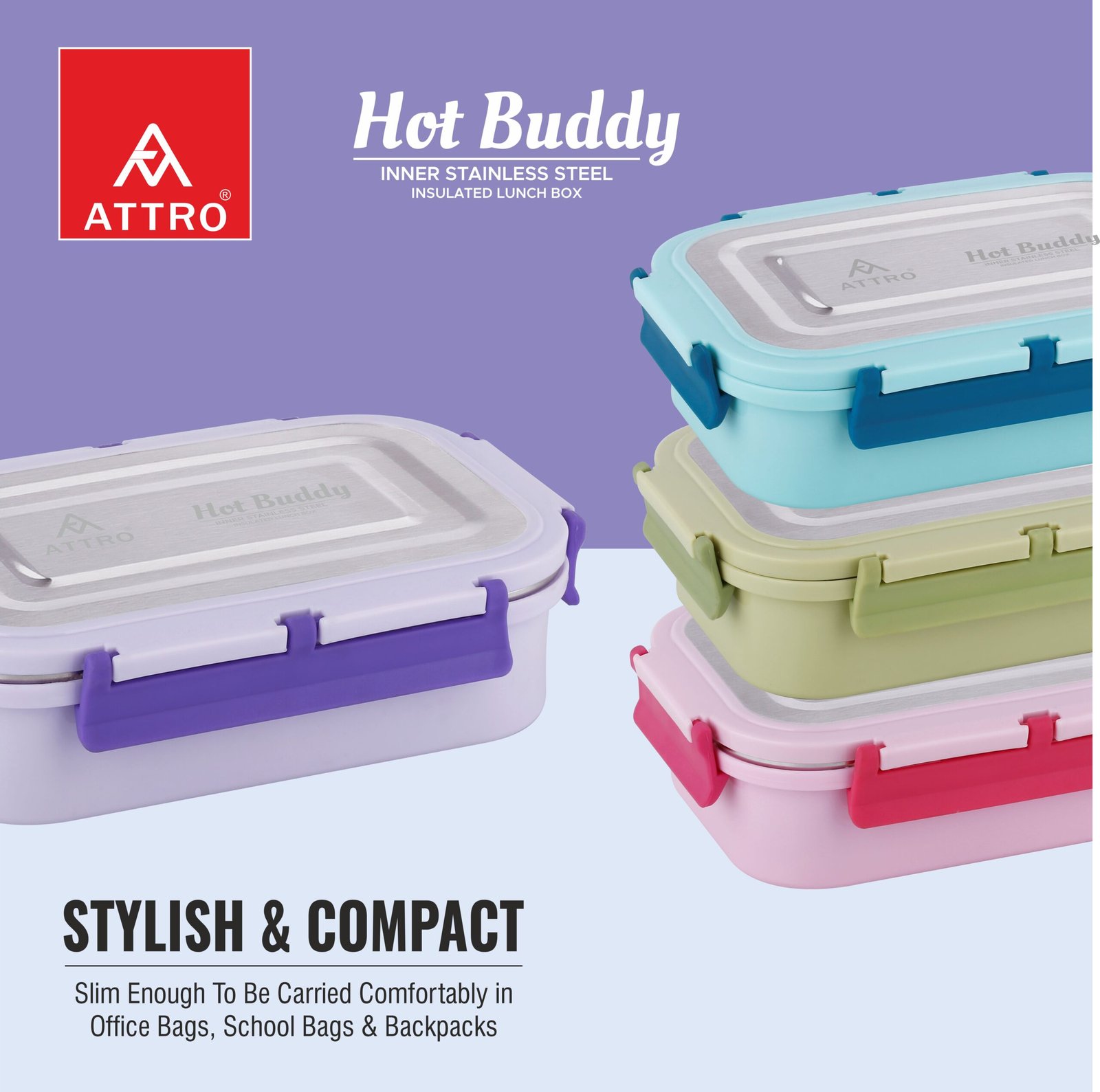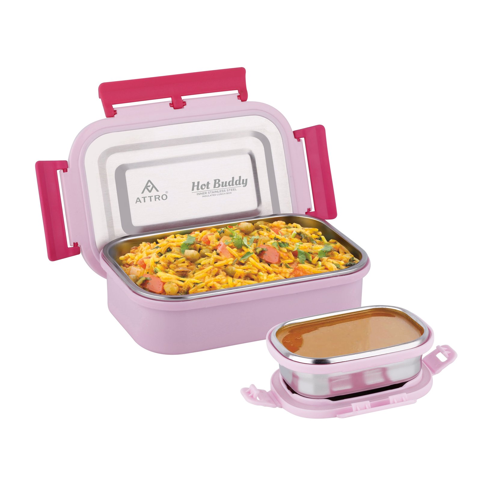The ATTRO Hot Buddy Insulated Lunch Box is crafted from BPA-free, food-grade materials, ensuring safe everyday use for office, school, and picnic meals. Designed with an airtight, spill-proof lid, this innovative lunch box keeps your food fresh and prevents leaks during travel or daily commutes. Its integrated small container (170ml) complements the main container (0.8ml), offering perfect portion control so you can pack snacks, sides, or condiments alongside your main meal. Engineered to maintain the temperature of hot or cold dishes, it ensures every bite is enjoyed at the perfect heat or chill. The sleek, compact, and travel-friendly design fits effortlessly into any bag or backpack, making it an ideal choice for busy professionals, students, and outdoor enthusiasts. With features like durability, effortless cleaning, and versatile meal prep convenience, this insulated lunch box is a must-have solution for a health-conscious, organized lifestyle.