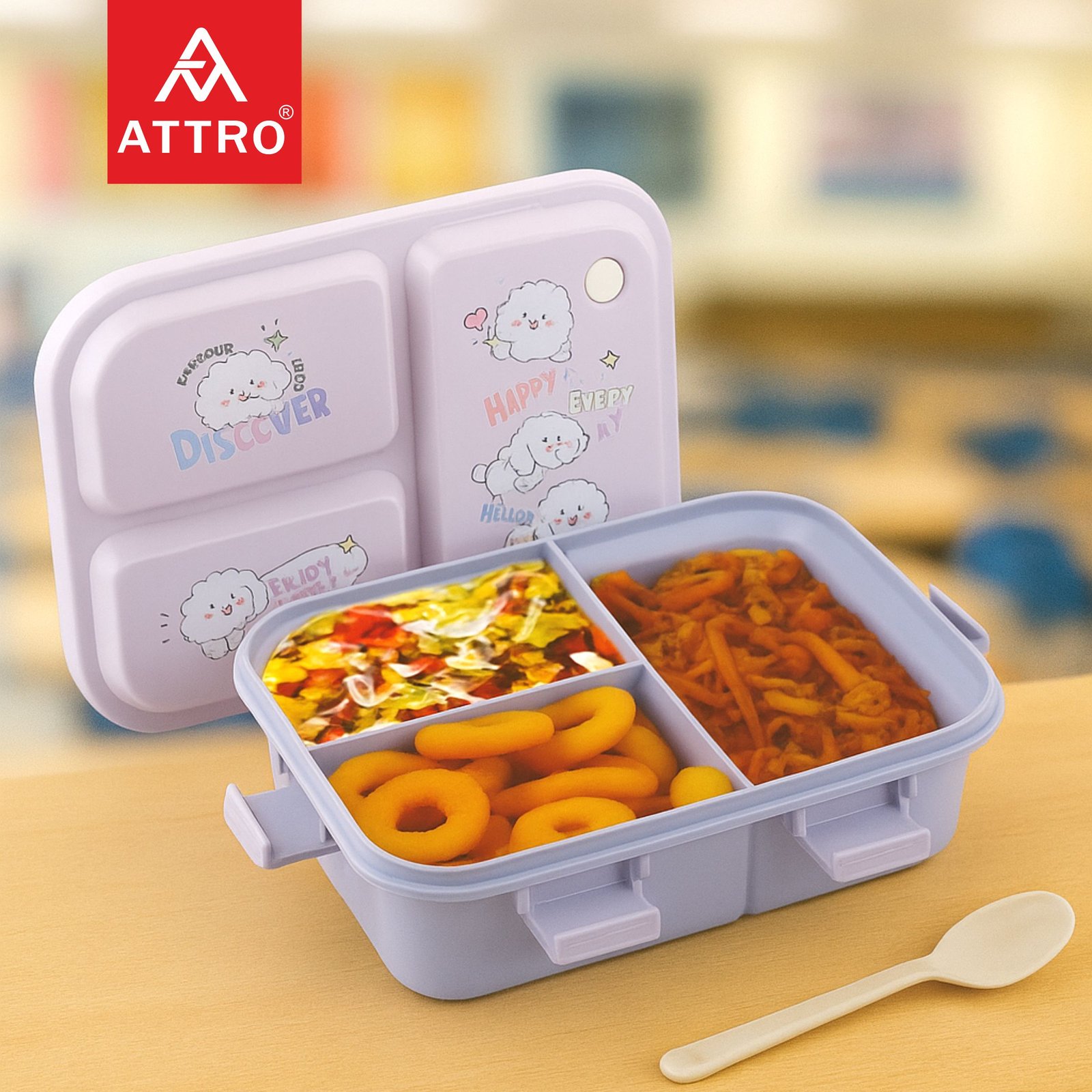 The ATTRO Joy Kins Plastic Lunch Box is a cheerful and spacious lunch solution crafted especially for kids. With 3 compartments totaling 1260ml, it allows you to pack a full meal with proper separation of snacks, veggies, and main course. Made from BPA-free, food-grade plastic, it is lightweight, durable, and leak-proof to prevent spills. Perfect for school, picnics, and on-the-go meals, it fits easily into backpacks. Comes with a sturdy plastic spoon for added ease. Designed to keep meals fresh, fun, and organized.