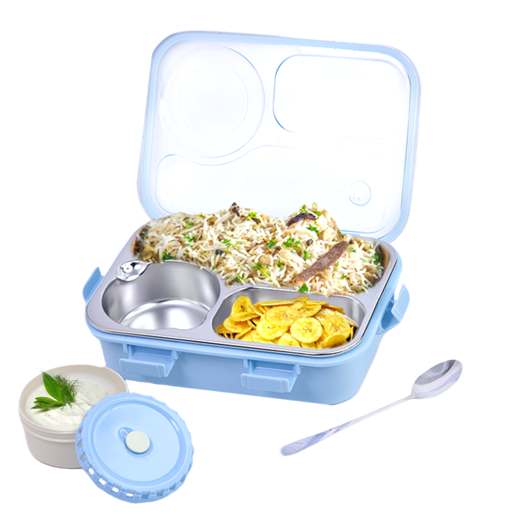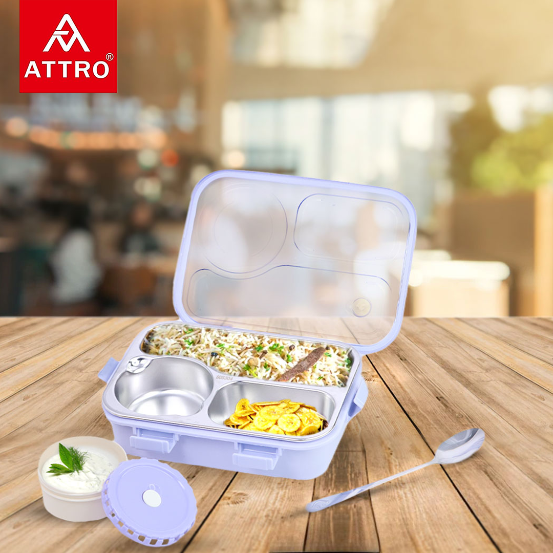 The ATTRO Lunch Pro Deluxe 3 Lunch Box is a premium leak-proof food container designed for fresh and hassle-free meals on the go. It features detachable inner stainless steel compartments that help retain food temperature, ensuring warm and delicious meals. The heating water insulation design keeps food fresh for hours, making it ideal for school, office, travel, and outdoor use. Made from BPA-free, food-grade materials, it ensures safe and healthy eating. This compact and stylish lunch box comes with a spoon and a small container, offering convenience for various meal types. Its secure locking lid prevents spills and leaks, making it perfect for carrying liquid-based dishes. Available in multiple colors, this lunch box is a durable, easy-to-clean, and lightweight solution for daily use. Whether you’re packing rice, salads, curries, or snacks, this multifunctional lunch box is an excellent choice for those who love organized and insulated meal storage. insulated lunch box, leakproof steel lunch box, BPA-free tiffin box, school lunch container, office lunch carrier, 3-compartment lunch box, meal prep container, food-grade tiffin, travel lunch box, thermal food container, stainless steel food storage, heating insulation lunch box, durable meal box, lunch carrier, eco-friendly food container.