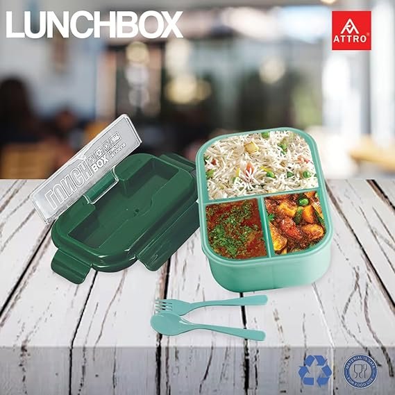 ATTRO Magic Lunch Box with 3 Compartments, 2 Spoons, Stylish Lid, Phone Holder, BPA-Free, 750ml