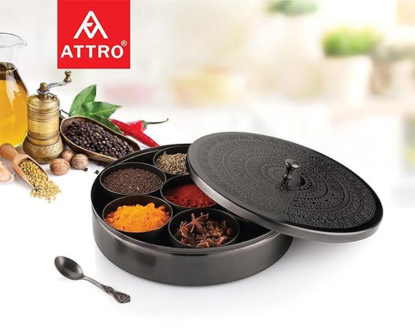• DURABLE, VERSATILE & PERFECT FOR GIFTING: Made from premium-quality materials, these spice boxes are sturdy, long-lasting, and easy to clean. Available in standard and 8-inch sizes, they fit perfectly in any kitchen setup, combining practicality with elegance. Whether for personal use or as a thoughtful gift, the Attro Designer Masala Dabba Collection is ideal for anyone who values both functionality and style in their kitchen essentials.