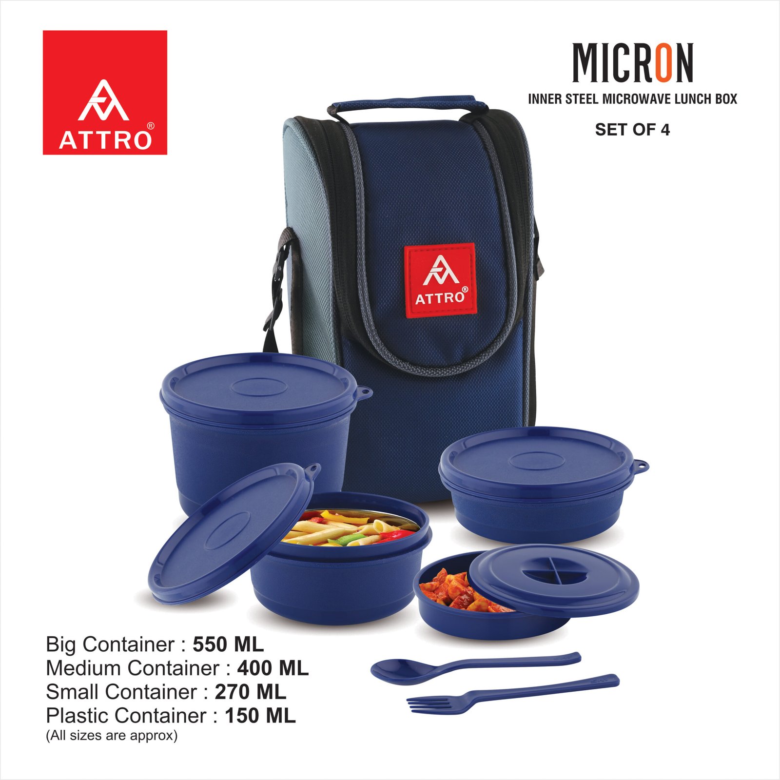 Attro Micron Stainless Steel 1040 ml Double Wall Lunch Box – 4 Containers with Bag, Fork & Spoon