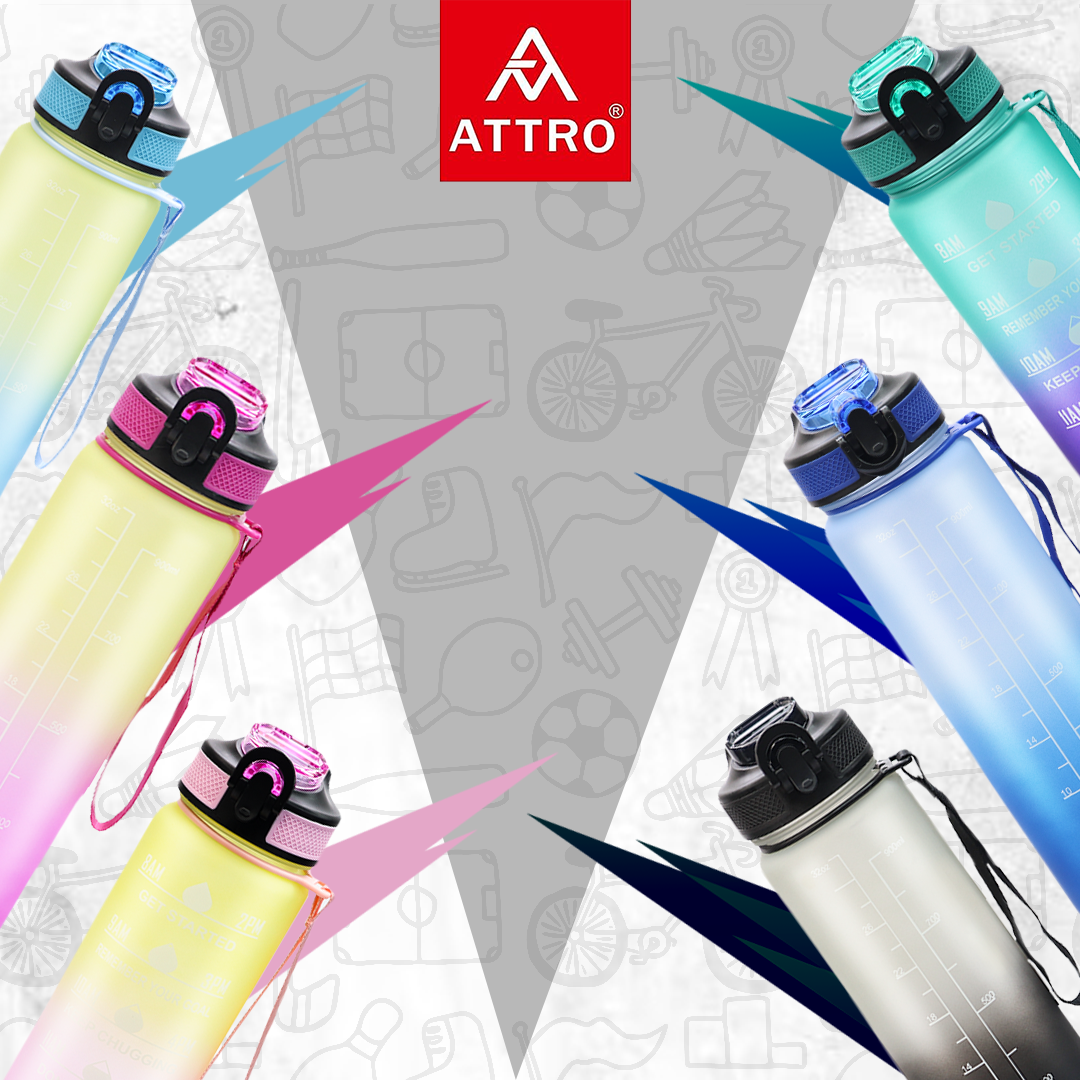 ATTRO Motivational Sports Water Bottle, designed to inspire you through every workout and daily activity. Featuring time markers and motivational quotes, it helps you track your water intake and stay on top of your hydration goals—perfect for fitness, weight loss, and overall wellness. Crafted from high-quality, BPA-free, and non-toxic materials, it ensures safe, healthy drinking every time. Built for durability and reliability, this bottle withstands tough workouts and outdoor adventures while remaining completely leak-proof. The easy-to-carry handle and hand strap make it ideal for gym sessions, school, travel, or office use. With its eco-friendly and reusable design, it promotes sustainable living by reducing single-use plastic waste.