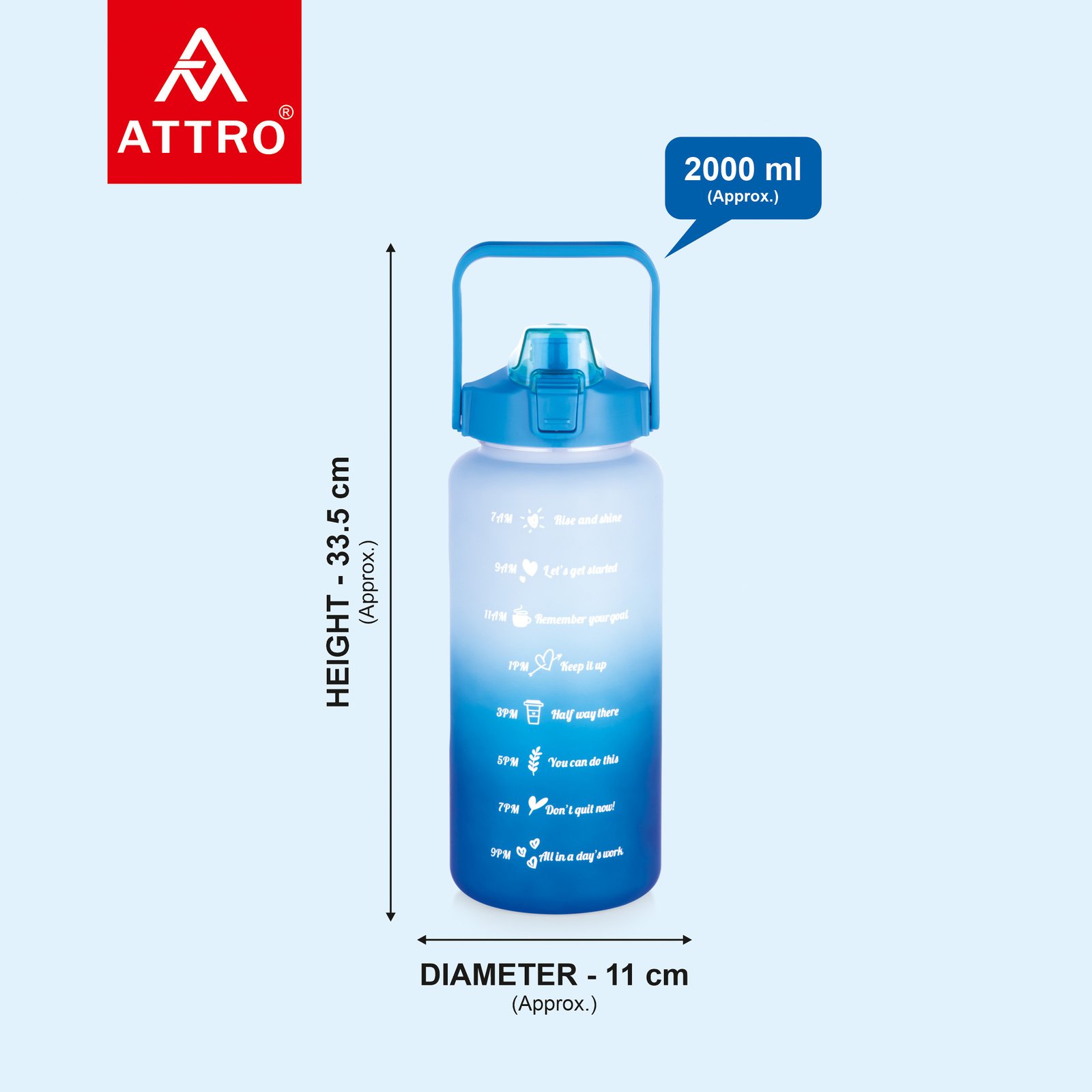 The ATTRO Motivational 2-Liter Sports Bottle is designed to keep you hydrated and inspired throughout the day. Featuring motivational quotes and time markers, it helps you track your water intake and stay on top of your fitness goals. Made from BPA-free, food-grade plastic, this bottle is safe, durable, and eco-friendly. The leak-proof design ensures a mess-free experience. Its dual-color gradient design adds a stylish touch, while the easy-to-carry handle and built-in straw make drinking effortless on the go. With a large 2-liter capacity, it eliminates the need for frequent refills, keeping you hydrated for long hours. 2-liter sports water bottle, motivational gym bottle, time marker water bottle, BPA-free hydration bottle, leak-proof workout bottle, large capacity fitness bottle, portable travel water jug, durable gym bottle with straw, office water bottle, eco-friendly sports flask.