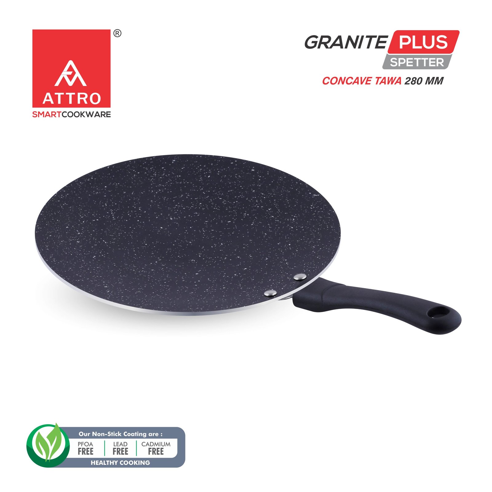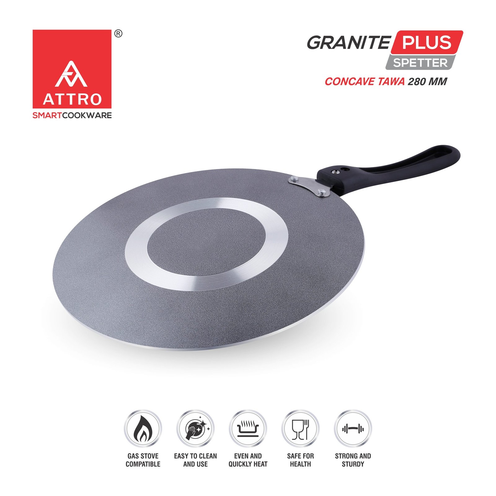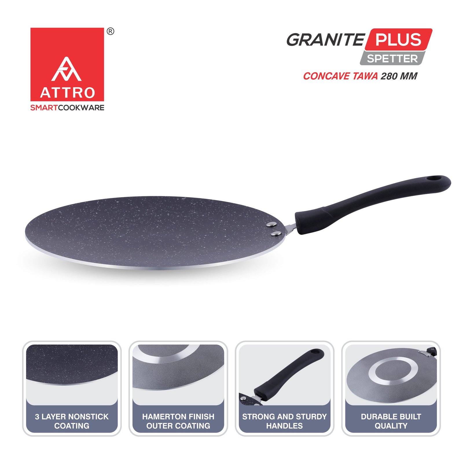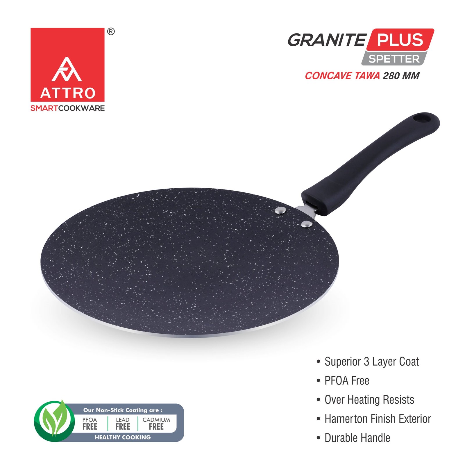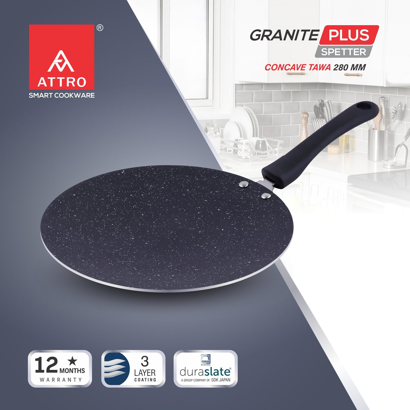The tawa features a concave base which allows provision to make a range of delicious food. Starting from fresh rotis to well shaped dosas as well as pancakes, you can make them all with the help of this tawa.The tawa has an easy ergonomic grip design while cooking.The Bakelite handle stays cool even while cooking thus offering you a hassle free cooking experience.DURASLATE 3 coat utilizes a special interlocking matrix of reinforcements that “binds” the primer, midcoat, and topcoat together.This matrix allows the three coating layers to virtually fuse together, resulting in far higher durability and food release.Our efforts are towards making the kitchen a smarter place enhancing convenience, reduce time spent & reflect modern lifestyles.Do not clean cookware with a metallic swab.