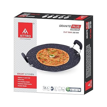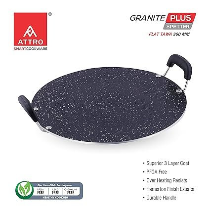 The tawa features a flat base which allows provision to make a range of delicious food. Starting from fresh rotis to well shaped dosas as well as pancakes, you can make them all with the help of this tawa.The tawa has an easy ergonomic grip design while cooking.The Bakelite handle stays cool even while cooking thus offering you a hassle free cooking experience.DURASLATE 3 coat utilizes a special interlocking matrix of reinforcements that “binds” the primer, midcoat, and topcoat together.This matrix allows the three coating layers to virtually fuse together, resulting in far higher durability and food release.Our efforts are towards making the kitchen a smarter place enhancing convenience, reduce time spent & reflect modern lifestyles.Do not clean cookware with a metallic swab.