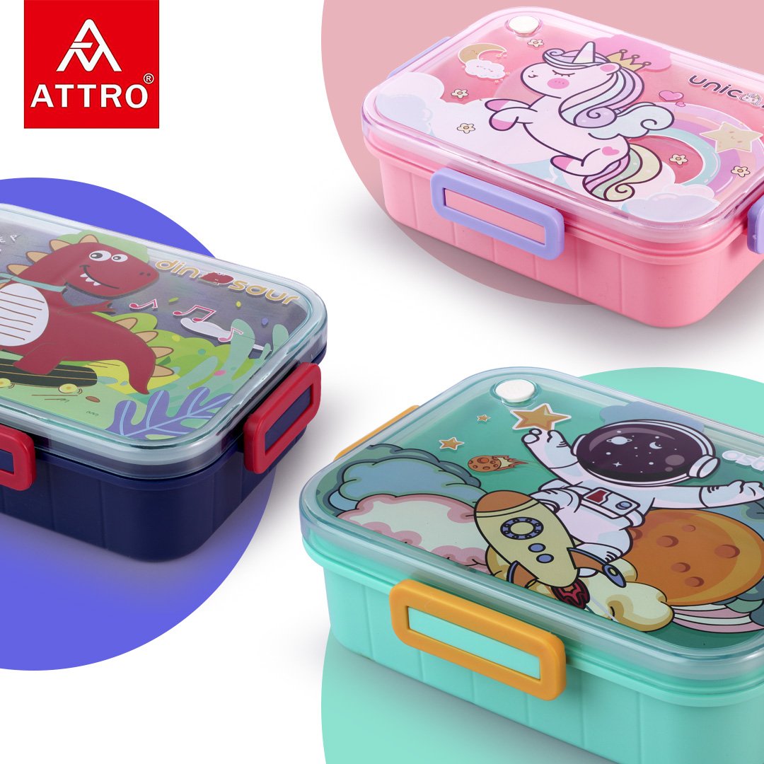 The ATTRO Quick 3 Lunch Box is a fun and practical meal solution for kids, designed to make lunchtime enjoyable and mess-free. With its different themes and vibrant colors, this 1300ml lunch box features three compartments, allowing kids to carry a variety of meals without mixing flavors. It includes a small container for sauces, dips, or snacks and a baby spoon for easy eating. Made from BPA-free, food-grade plastic, it ensures safe and hygienic food storage for daily use. The lightweight yet durable design makes it perfect for school, picnics, daycare, travel, and outdoor meals. The secure, anti-spill lid prevents leaks, keeping bags clean and mess-free. Its compact and kid-friendly design easily fits into backpacks and lunch bags. Available in multiple themes and colors, the ATTRO Quick 3 Lunch Box is a great gift choice for children who love fun and colorful meal containers. kids lunch box, school lunch box, BPA-free tiffin box, 3-compartment lunch box, colorful lunch box, cartoon lunch box, food-grade plastic lunch box, lightweight tiffin box, non-toxic kids lunch box, leak-proof lunch box, snack box for kids, daycare lunch box, spill-proof tiffin box, travel-friendly lunch box, kids meal box.