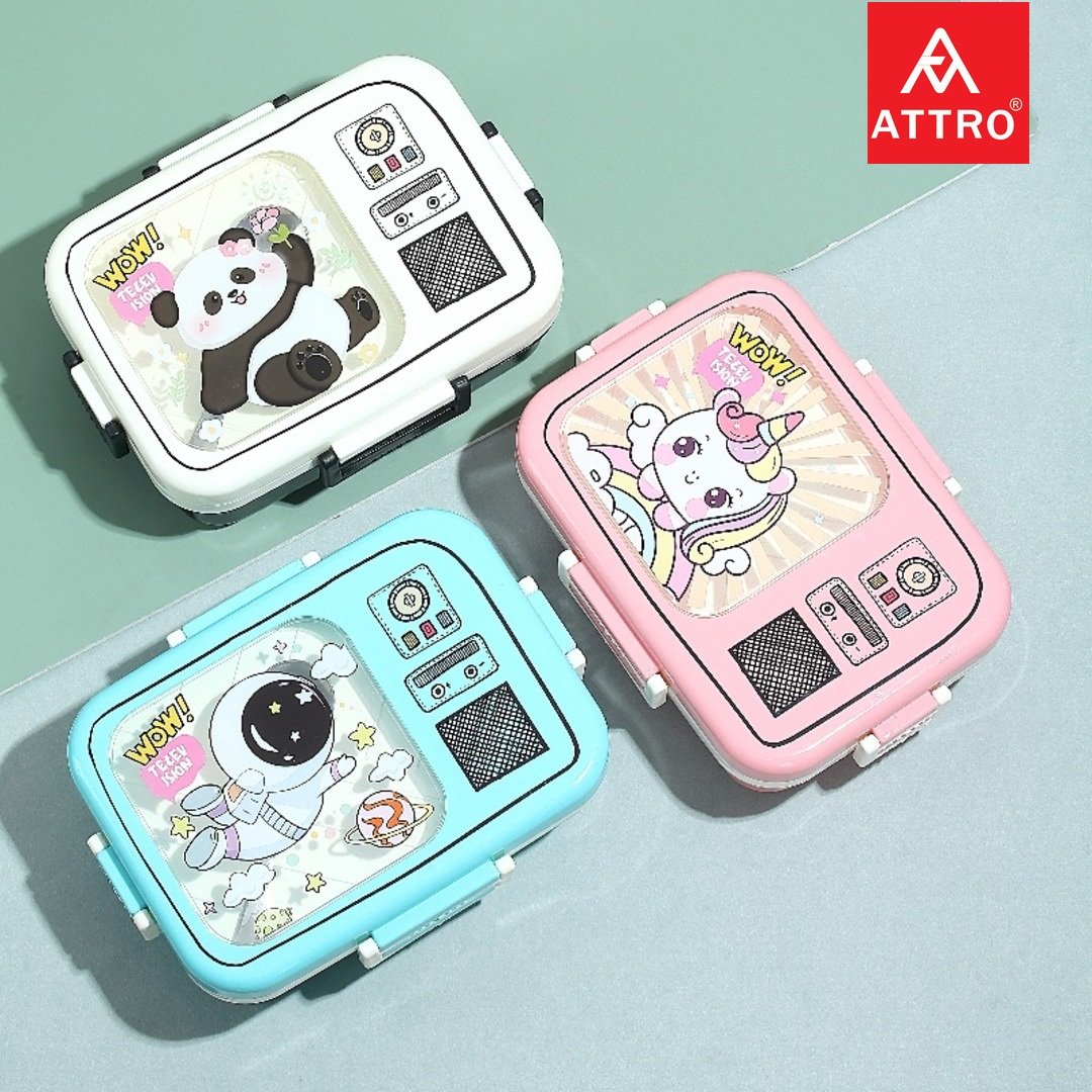 The ATTRO Rock Star Panda Themed Kids Lunch Box is a fun, durable, and practical meal container designed to keep food fresh and organized. Featuring an inner stainless steel design with three compartments, it allows kids to enjoy a variety of meals without mixing flavors. This leakproof and airtight lunch box includes one small container, a spoon, and a separate internal lid, ensuring a mess-free and hygienic eating experience. Made from BPA-free, food-grade materials, it is completely safe for daily use. The secure locking system prevents spills, making it an ideal choice for school, picnics, travel, and outdoor activities. Its compact and lightweight design fits easily into school bags, while the panda-themed print and vibrant colors add a touch of fun. This stylish and functional lunch box is perfect for kids who love adorable designs and is also a great gift option. kids lunch box, panda lunch box, stainless steel tiffin, school meal container, BPA-free food container, leakproof kids tiffin, compartment lunch box, airtight food box, thermal lunch container, travel-friendly meal box, bento lunch box for kids, reusable food storage, best school lunch box, insulated meal carrier, cute kids lunch box.