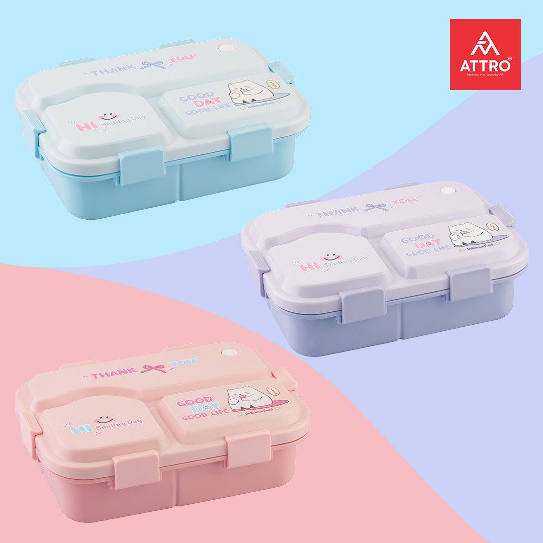 The ATTRO Smiley Bite Plastic Lunch Box is a fun and practical mealtime companion designed especially for kids. Crafted from high-quality, food-grade plastic, this bento-style lunch box features 3 spacious compartments to keep different foods neatly separated and fresh. It comes with a durable, leak-proof design that prevents spills, making it ideal for school, picnics, and outdoor use. The included plastic spoon ensures kids can enjoy their meals easily anywhere. With a total capacity of 1220ml + 200ml, this lightweight lunch box offers ample space for balanced meals. Available in Blue, Purple, and Pink, its cheerful design and smiley pattern make lunchtime more enjoyable for children.