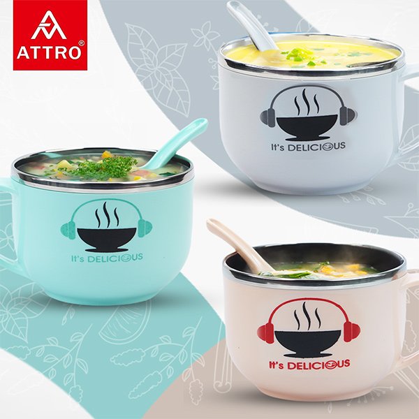 The ATTRO Spicy Bowl Noodle Soup Bowl 500ml is a versatile and stylish food container designed for enjoying a variety of meals. With an inner stainless steel lining, it helps retain the temperature of your food, keeping soups, noodles, and beverages warm for longer. The BPA-free, food-grade plastic outer body ensures durability and safe usage for daily meals. This lightweight and portable bowl comes with a secure lid and spoon, making it perfect for breakfast cereals, fruits, ramen, instant noodles, soups, salads, and beverages. The leak-proof design prevents spills, making it great for home, office, school, and travel. Its compact and ergonomic shape allows easy handling, while the modern, colorful design adds a touch of style to your meals. Available in multiple colors, this bowl is ideal for both kids and adults. Whether you’re at home or on the go, the ATTRO Spicy Bowl is your perfect meal companion for fresh and delicious food anytime. noodle soup bowl, stainless steel soup bowl, ramen bowl, BPA-free food container, leak-proof noodle bowl, insulated food bowl, compact lunch bowl, cereal bowl, salad bowl, travel food container, kids’ lunch bowl, reusable food bowl, portable meal container, thermal soup bowl, office lunch bowl.