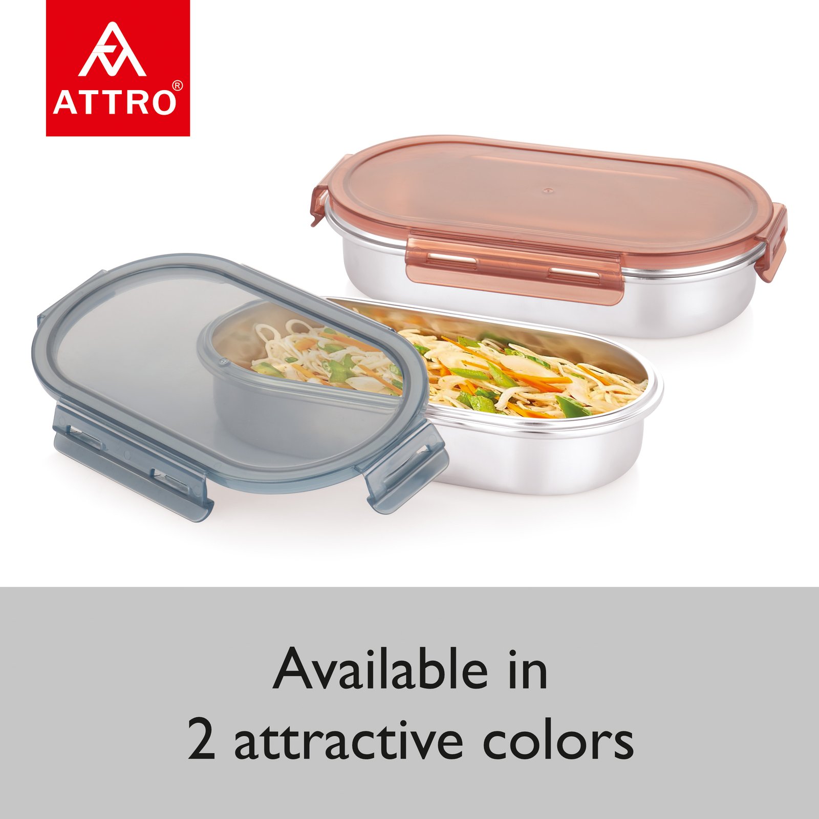 The ATTRO Steelox Stainless Steel Container Series is designed to combine durability, safety, and elegant style for everyday use. Made from premium food-grade stainless steel, each container keeps your meals fresh, hygienic, and completely leak-proof. The airtight plastic seal lid ensures no spills, making these containers perfect for school, office, travel, or outdoor lunches.This collection includes Rectangle (560ml & Long Rectangle 630ml) and Oval (540ml) variants to suit different portion needs. Each piece is crafted from BPA-free, food-safe materials that guarantee long-lasting quality and easy maintenance. Available in stylish Brown and Grey colors, the ATTRO Steelox range not only provides practical meal storage but also adds a touch of modern sophistication to your daily routine.